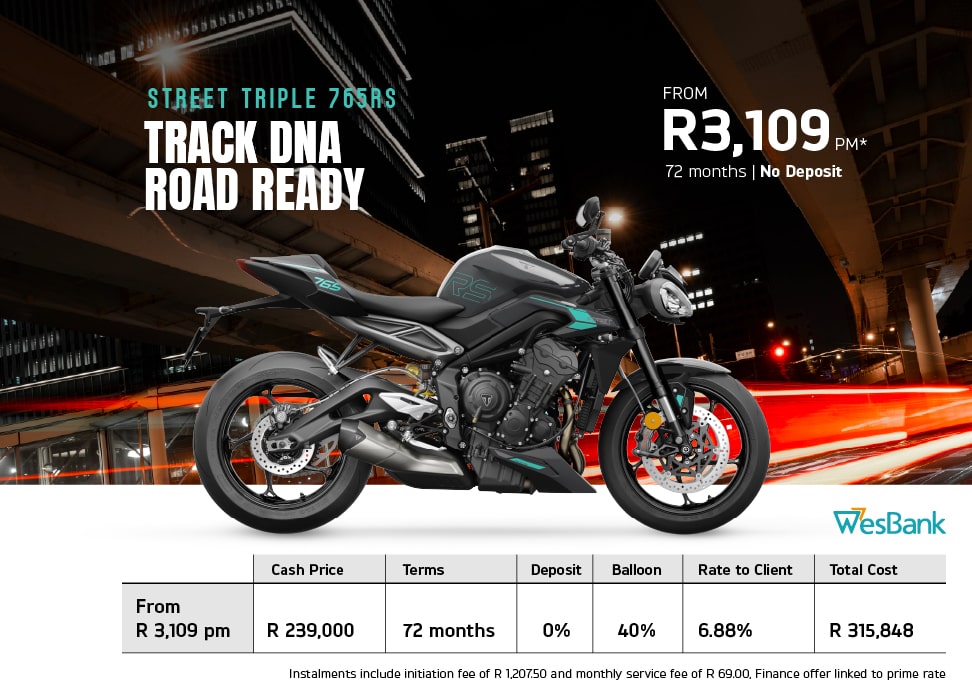 Pure exhilaration, born on the track, built for the street. The Street Triple 765 RS delivers Moto2™-inspired performance and razor-sharp handling. For a limited time, enjoy an interest rate of 6.88%, that’s 3.62% below prime, when purchasing a brand-new Street Triple 765 RS. Starting from just R 3,109 per month over 72 months. Price shown for standard model. Optional paint variants available at an extra cost.